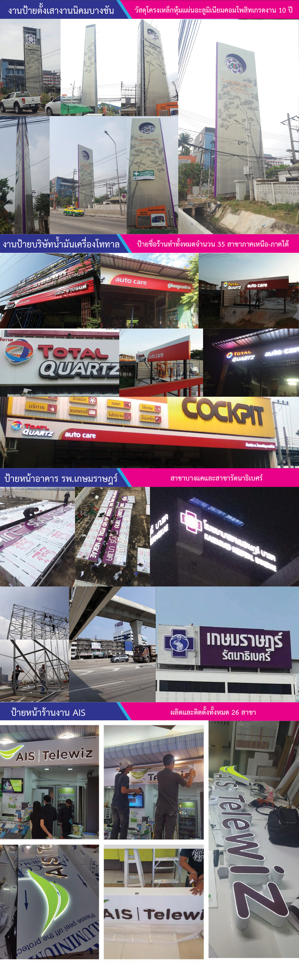 และประสบการณ์ งานรวดเร็ว เรียบร้อย รับติดตั้งงานป้ายทั่วประเทศ งานกลางวันและกลางคืน มีมาตราฐาน โดยจากผลงานต่างๆที่มีการผลิตและติดตั้ง ในส่วนของวัสดุที่ใช้ได้มีการรับรองจากทางโรงงานชื่อดังซึ่งเป็นผู้ผลิตมีมาตราฐานในเรื่องการรับประกันผลงาน